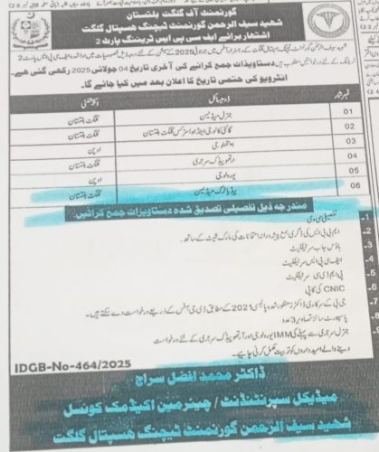 شہید سیف الرحمٰن گورنمنٹ ٹیچنگ ہسپتال گلگت میں FCPS Part-II پوسٹ گریجویٹ ٹریننگ کے لیے داخلے کا اعلان کیا جاتا ہے۔